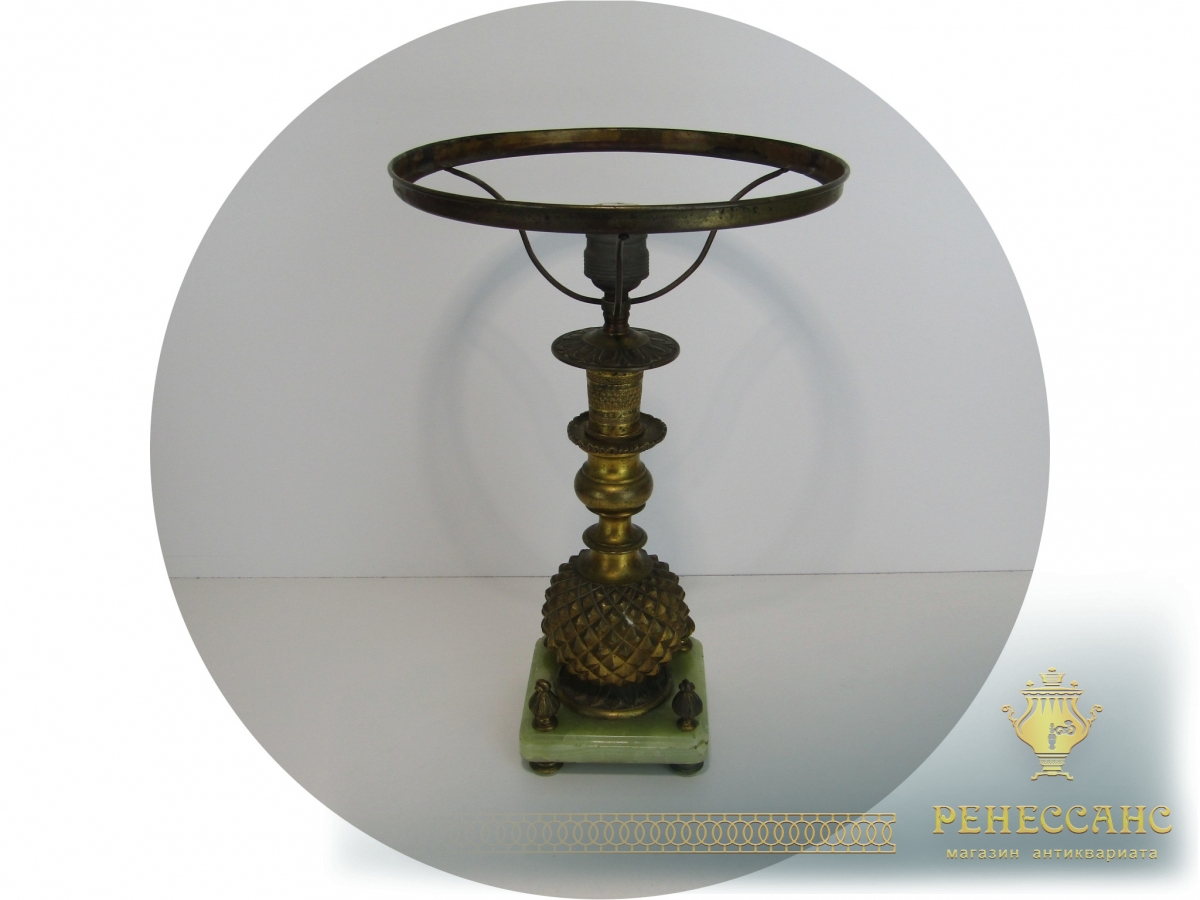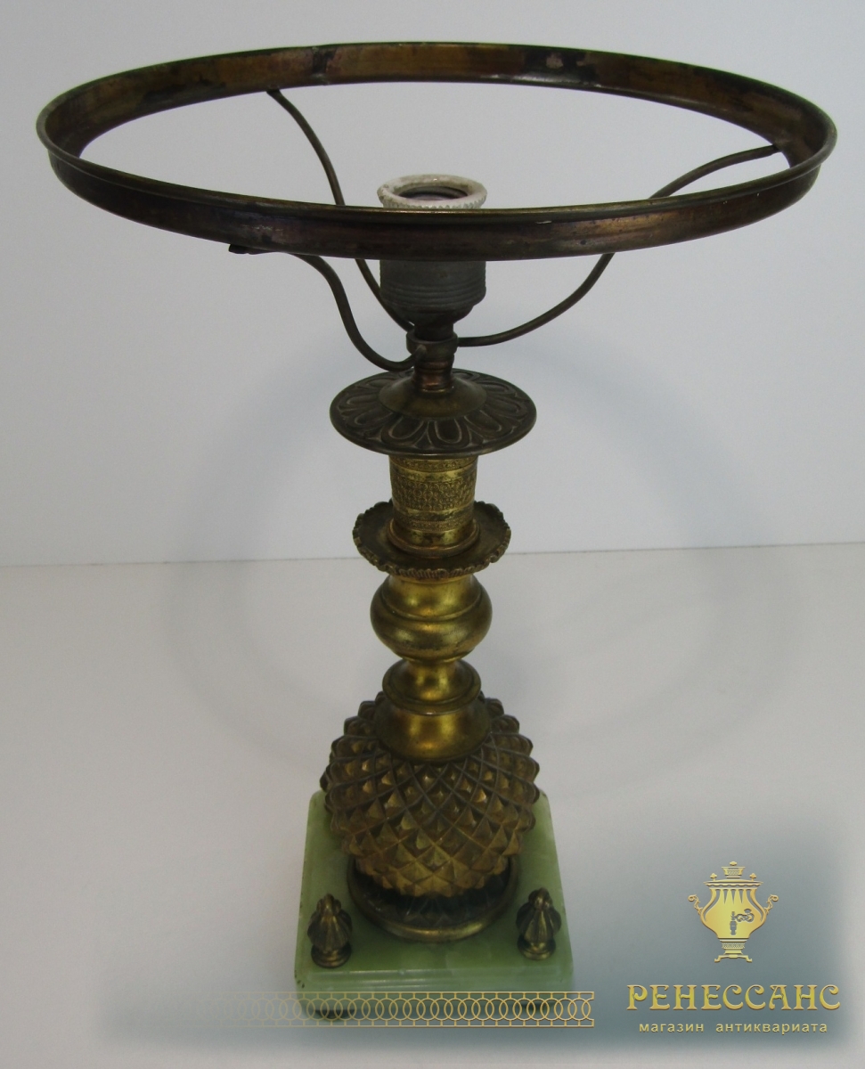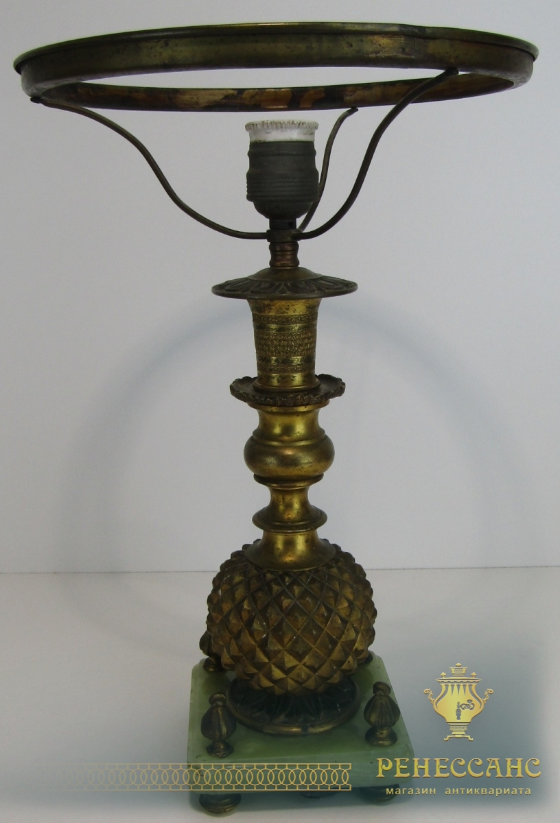 Высота 41,5 см, габариты основания 13,2*13,2 см, диаметр под плафон 26 смБронза, позолота, каменьСостояние на фото