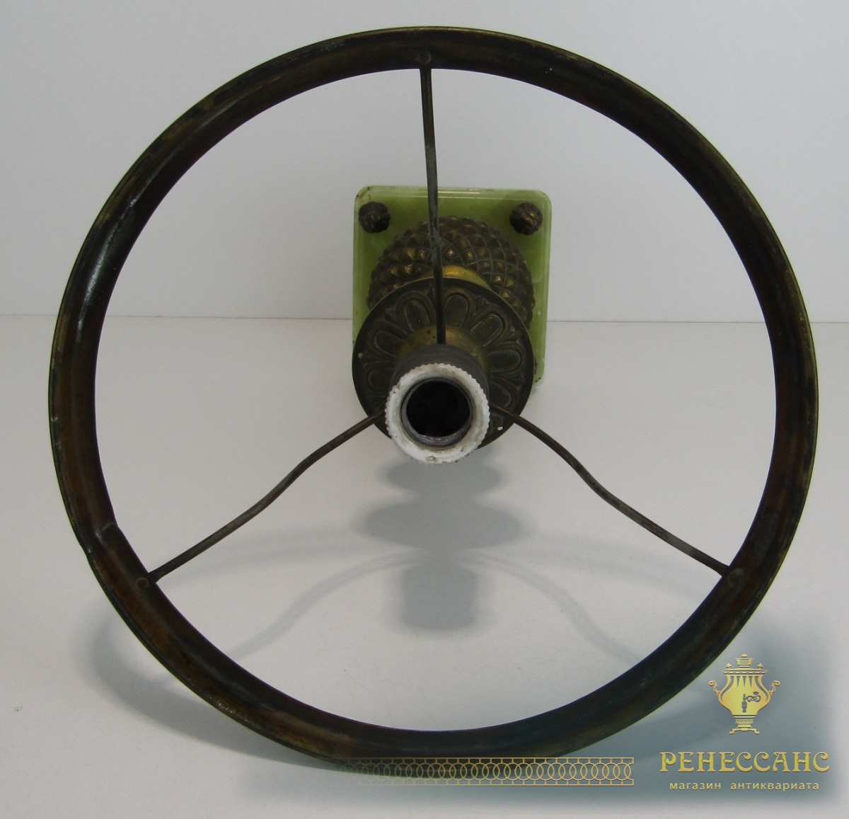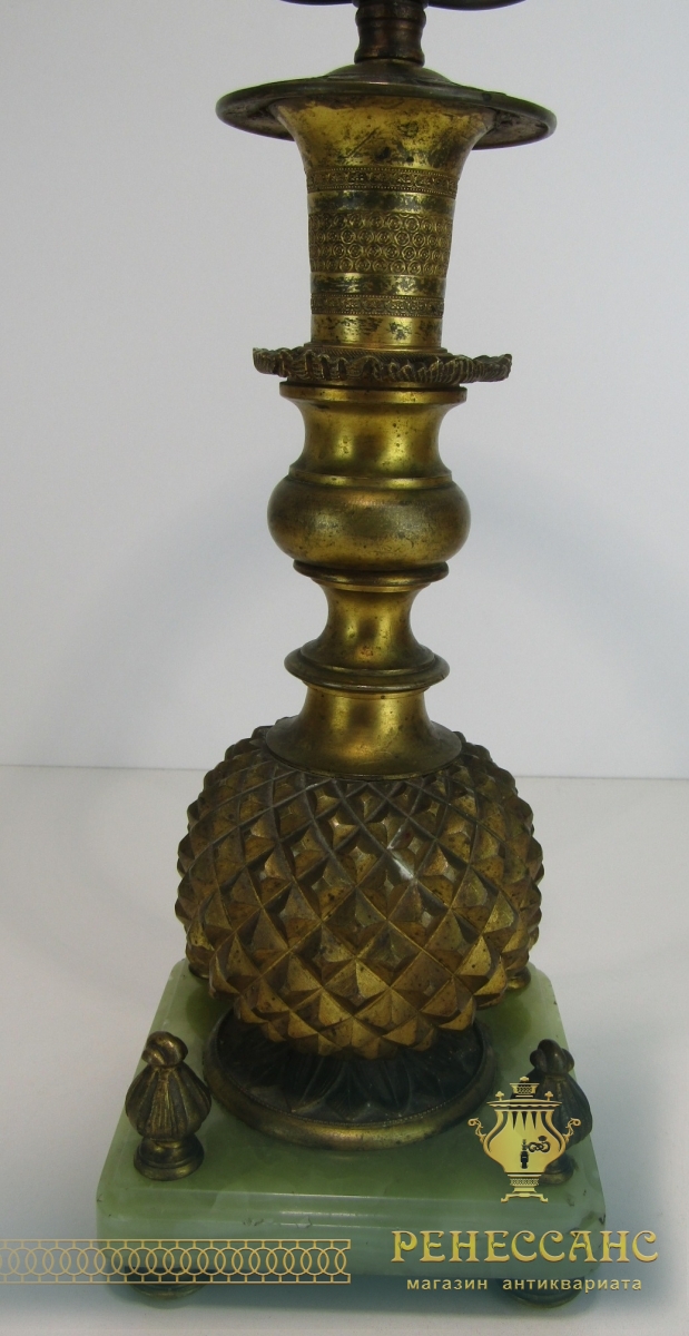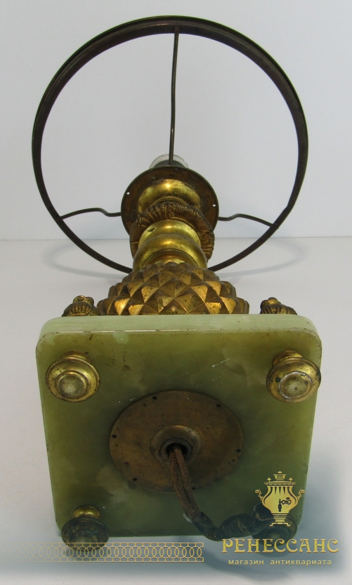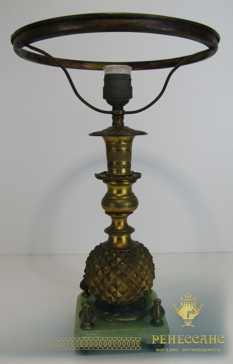 Высота 41,5 см, габариты основания 13,2*13,2 см, диаметр под плафон 26 смБронза, позолота, каменьСостояние на фото