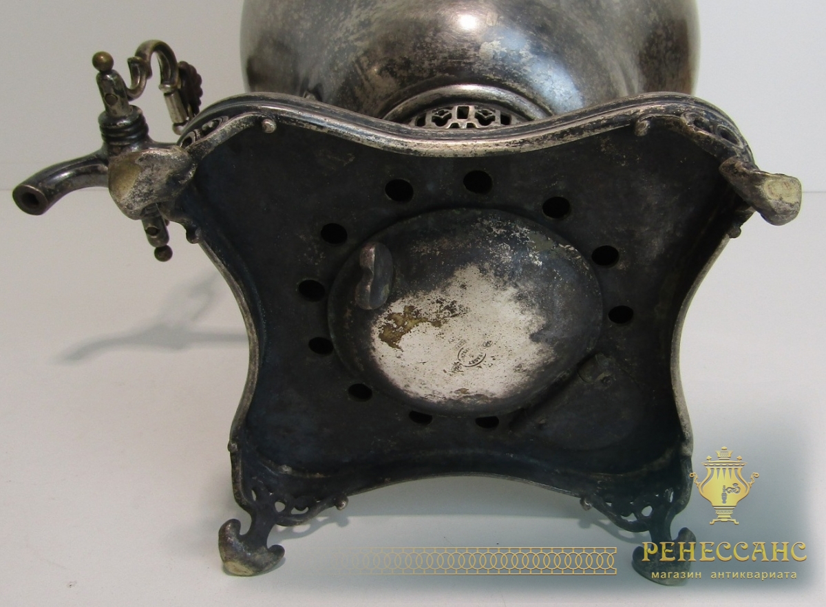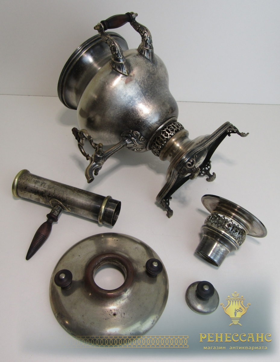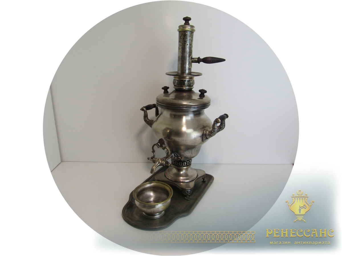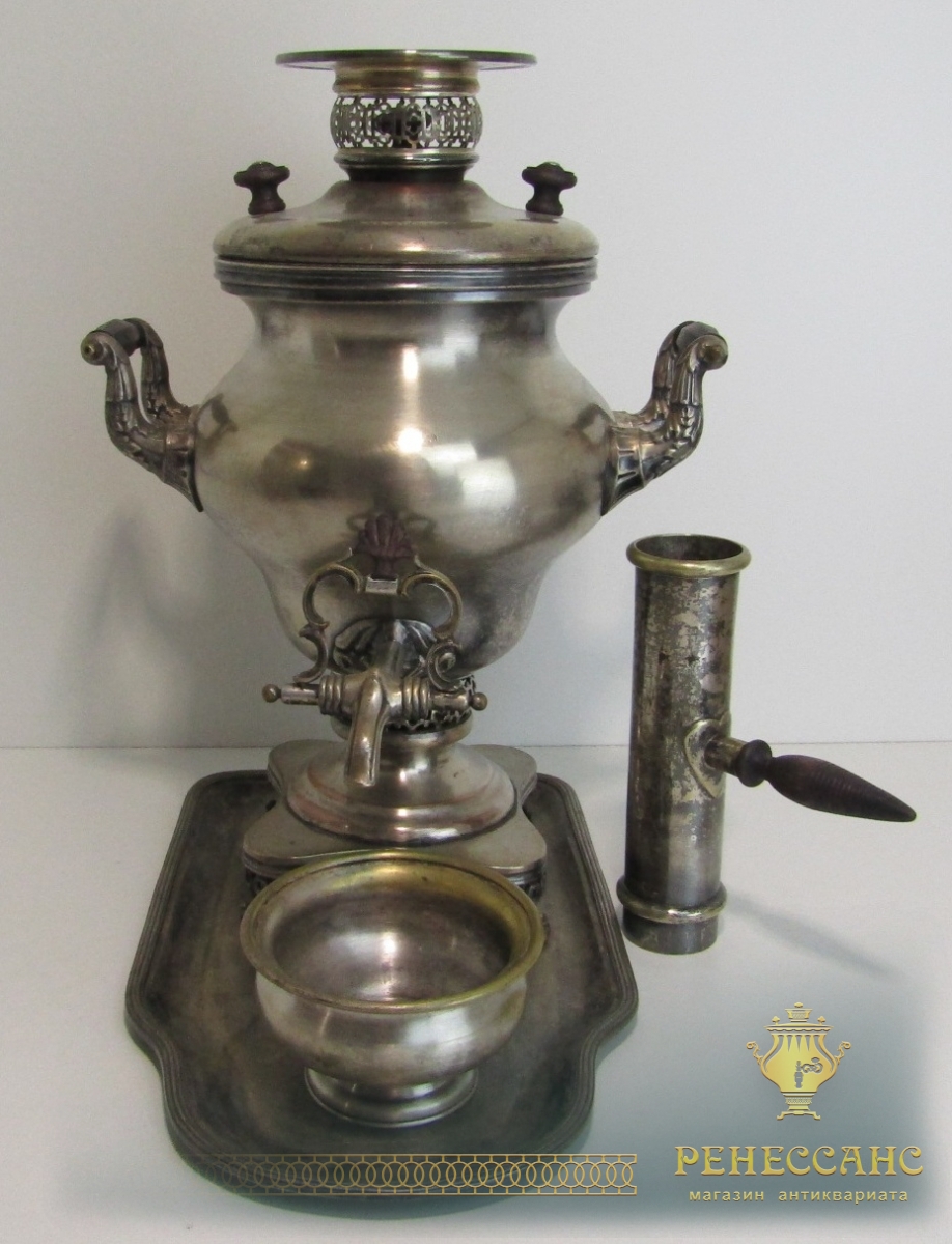 Коллекционный угольный самовар с трубой на подносе и полоскательницей №1911