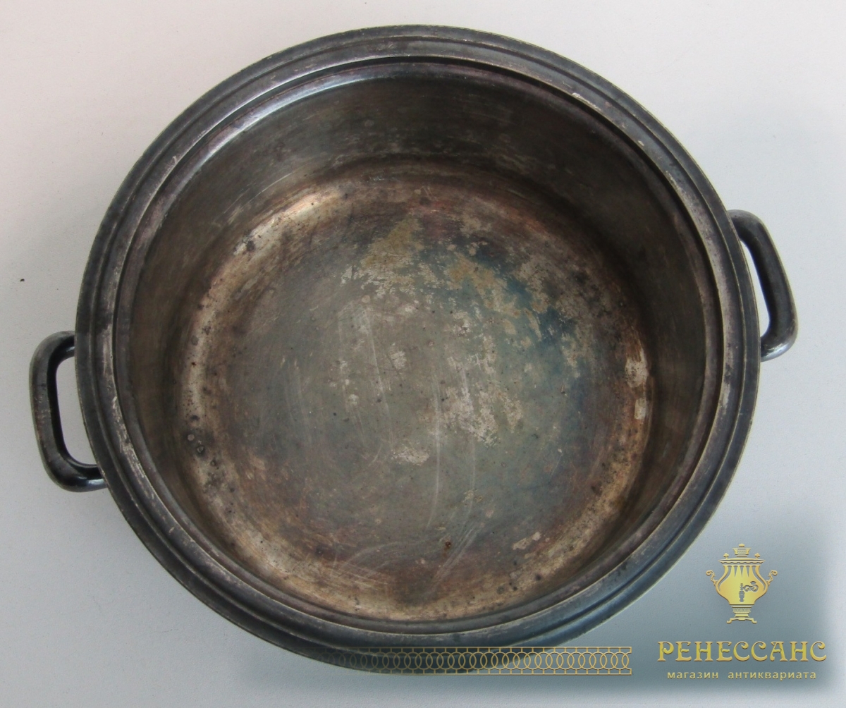 Мельхиор, серебрениеВысота 6,5 см, внешний диаметр 18 см, диаметр под крышку 16 см