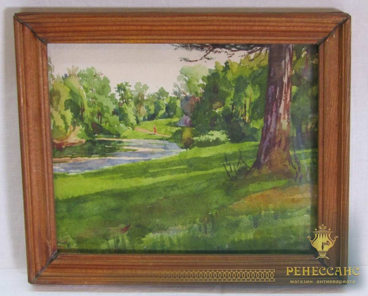 Старинная картина «Парк, природа», холст, акварель, габариты без рамы 12,5*15,5 см, подпись на фото, «Ксидиас» Россия 19 век